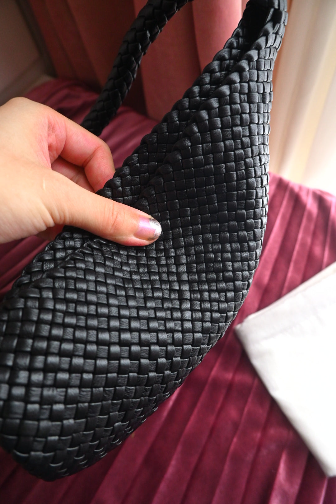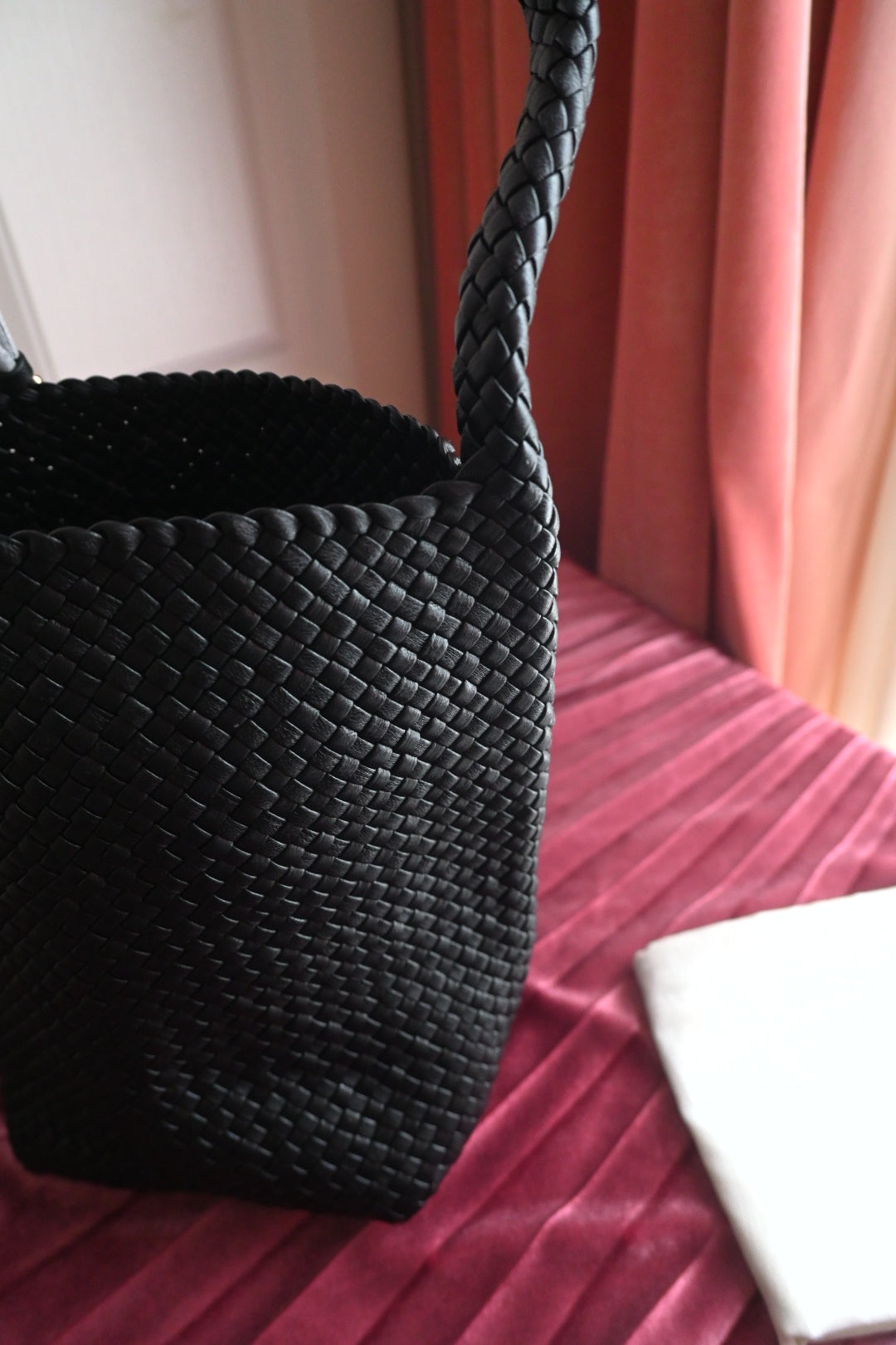 Small woven north south tote bag